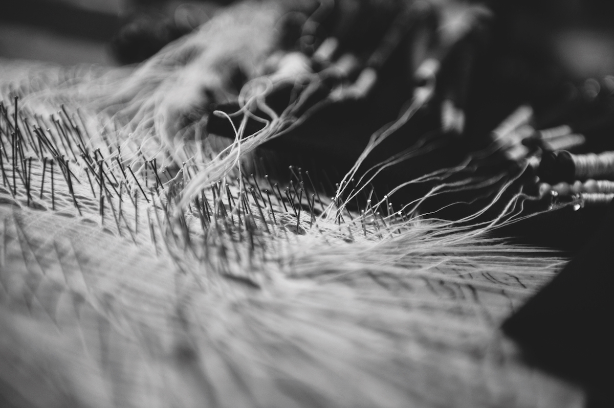 The first few inches of ‘Seableed’, my response to the pattern I saw floating on the marsh water last summer, now cover my lace pillow. It might look impossibly complicated, but it’s more straightforward than you think. Using four bobbins at a time, a pair in each hand, the lacemaker uses a binary system – think plain and purl in knitting, or 1 and 0 in computer code. With lace it is ‘half-stitch’ and ‘whole-stitch’. Everything is a combination of these two things. For whole-stitch, you cross the two centre bobbins, left over right, then twist the left-hand and right-hand pairs right over left, then cross the centre bobbins again. This weaves the two pairs of threads through each other. Half-stitch leaves out the last movement.
