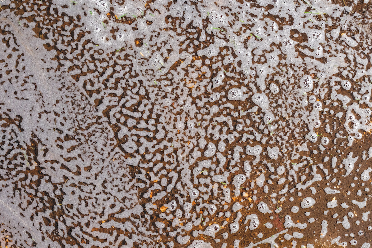 Other walkers pass unheeding as I crouch with my camera, attempting to capture this delicate moment – often shifting, disappearing even as I press the button. I later ponder its significance as I preserve its shape in thread. Back towards the edge of the marsh, as I make my way home along another causeway, reputedly built to train soldiers of World War I to practise hauling artillery across Flanders mud, I pass the pool that inspired my most adventurous set of lace panels. It held a huge pattern of bubbles, likely to be oxygen and nitrogen, sent up by the encroaching tide from roots in already waterlogged, oxygen-poor soil.